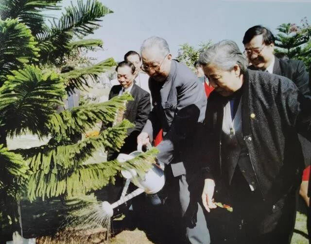 华国锋在深圳锦绣中华参观时,植树留念。华国锋和夫人正在为刚刚栽种好的树浇水