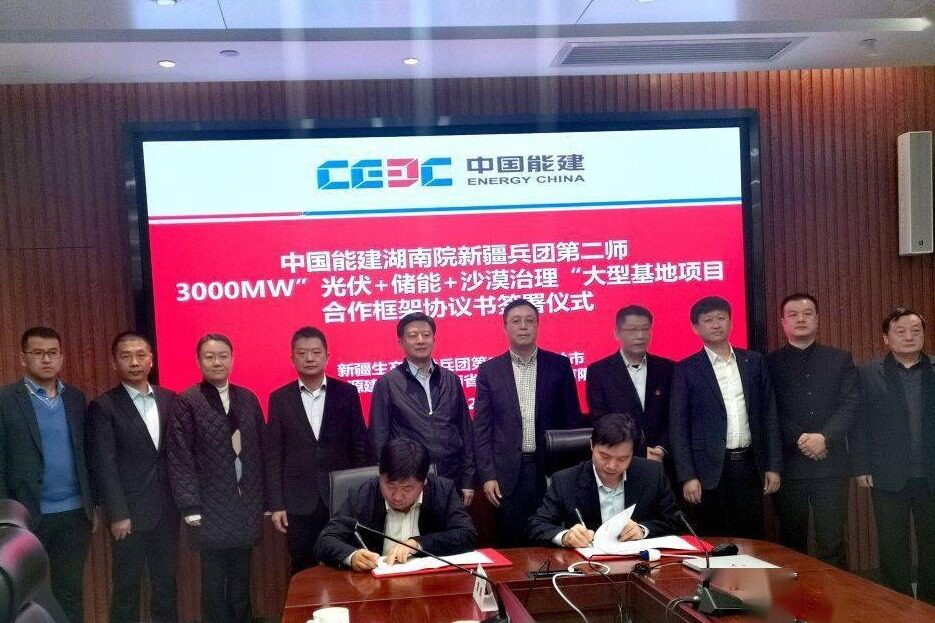 基地项目的建设实施,可带来巨大的社会经济效应。2022年1月10日,新疆兵团第二师铁门关市考察团到访中国能建湖南省电力设计院有限公司,双方签约了3GW光伏+储能+沙漠治理大基地合作框架仪式。