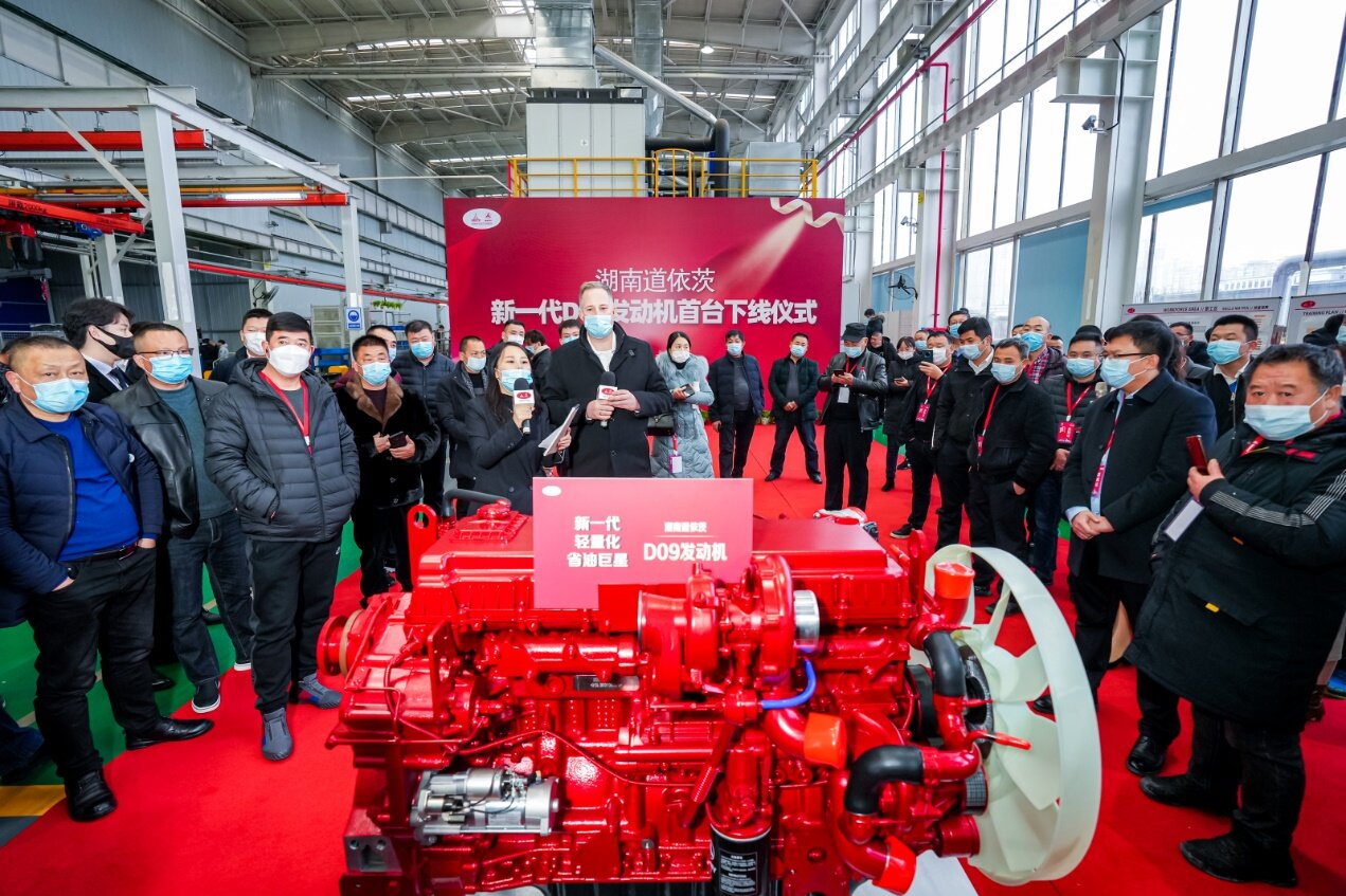 2022年1月10日,湖南道依茨于湖南长沙三一产业园21号厂房举办了新一代D09发动机下线仪式,三一重工高级副总裁、工程车辆事业部董事长向儒安先生,泵送公司常务副总经理陈添明先生、湖南道依茨总经理胡育宏先生,德国专家豪斯乐先生出席本次活动。现场百余名搅拌车终端客户共同见证新一代D09发动机首台亮相。