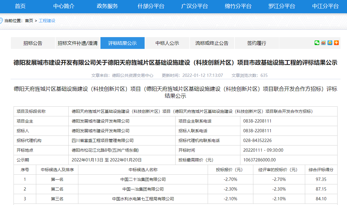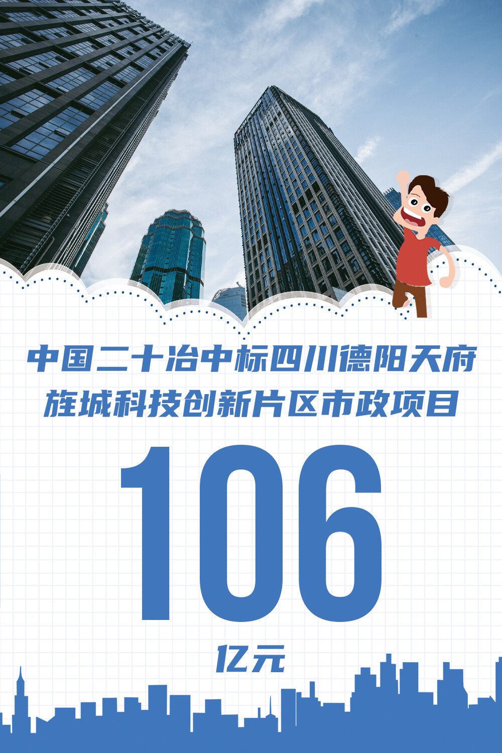 2022年01月12日,德阳市公共资源交易中心发布德阳天府旌城片区基础设施建设(科技创新片区)项目市政基础设施工程评标结果公示,中国二十冶集团有限公司中标,总投资约为106.37亿元。