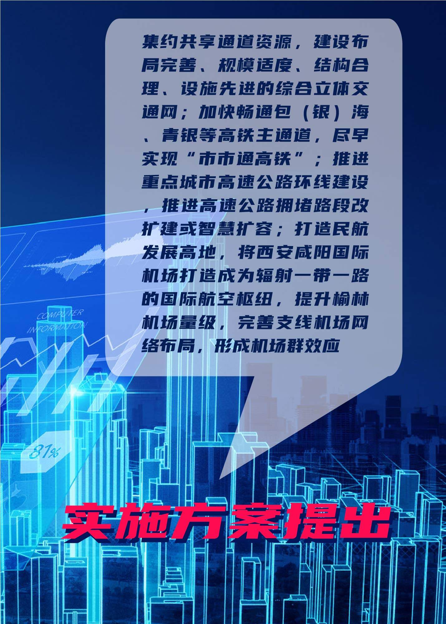 《实施方案》提出,集约共享通道资源,建设布局完善、规模适度、结构合理、设施先进的综合立体交通网;加快畅通包(银)海、青银等高铁主通道,尽早实现“市市通高铁”;推进重点城市高速公路环线建设,推进高速公路拥堵路段改扩建或智慧扩容;打造民航发展高地,将西安咸阳国际机场打造成为辐射一带一路的国际航空枢纽,提升榆林机场量级,完善支线机场网络布局,形成机场群效应。