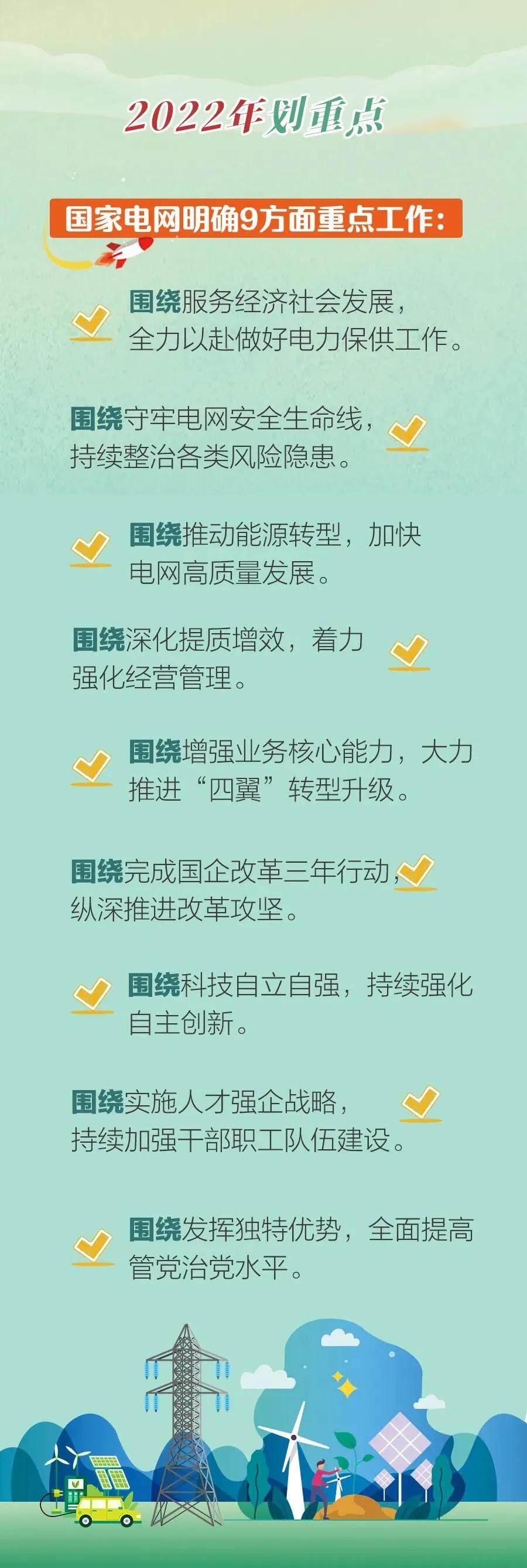 辛保安强调,实现全年目标,要坚持统筹兼顾、突出重点任务,着力抓好九个方面的工作。一要围绕服务经济社会发展,全力以赴做好电力保供工作。加大资源优化配置力度,加强需求侧管理,确保圆满完成北京冬奥会、党的二十大等重大保电任务。二要围绕守牢电网安全生命线,持续整治各类风险隐患。抓好专项整治三年行动收官,提高大电网安全风险防控能力,不断夯实安全基础。三要围绕推动能源转型,加快电网高质量发展。抓好规划前期工作和重点工程建设,积极服务新能源发展,提高电网数字化水平。四要围绕深化提质增效,着力强化经营管理。深入挖潜增效,大力增供扩销,扎实稳妥推进代理购电,提升供电服务水平。五要围绕增强业务核心能力,大力推进“四翼”转型升级。提升金融业务发展质量,稳健拓展国际业务,大力发展支撑产业,加快培育战略性新兴产业。六要围绕完成国企改革三年行动,纵深推进改革攻坚。落实公司“改革实效年”部署,确保国企改革任务务期必成,深入推进电力改革,深化企业内部改革。七要围绕科技自立自强,持续强化自主创新。加快技术攻关,完善创新体系,鼓励基层创造,力争取得更多引领性、战略性、支撑性成果。八要围绕实施人才强企战略,持续加强干部职工队伍建设。深入推进“四优五过硬”领导班子和干部人才队伍建设,统筹推进各类人才发展,关心关爱职工。九要围绕发挥独特优势,全面提高管党治党水平。突出抓好政治建设,持续推动党建提质登高,深化全面从严治党,加强意识形态和宣传思想工作。(转载请注明见道网www.seetao.com)见道网工程栏目编辑/张韬