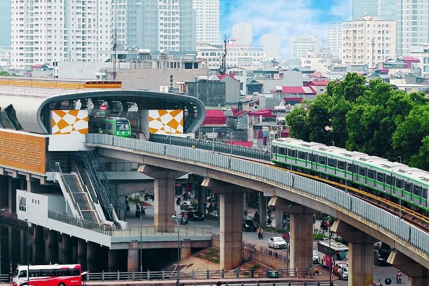 如今,高架独柱车站建筑已经成为越南河内的新地标,箱梁架设也开创了越南架梁施工的里程碑,城市轻轨短轨枕式整体道床施工等多专业科技成果在轻轨施工中遍地开花,通信、信号、供电、机车设备、AFC五大领先设备系统技术扎根越南,技术先进、安全可靠、性价比高的中国轻轨品牌享誉国际。