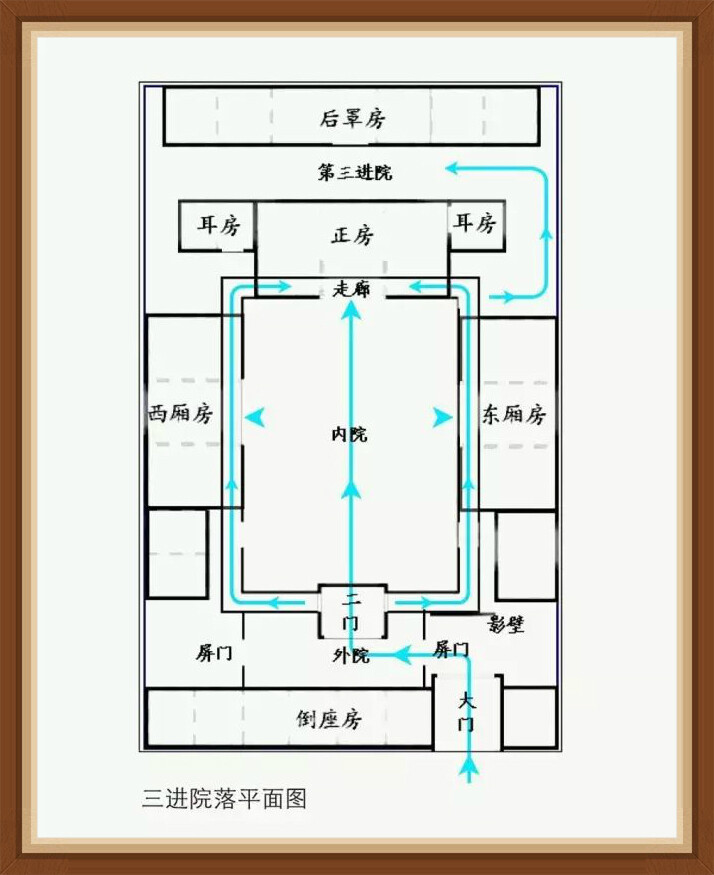 The courtyard is a house with a gatehouse in front of the courtyard. The "mouth" shape is called the one-in courtyard; the "day" shape is called the two-in courtyard; the "mesh" shape is called the three-in courtyard. In the courtyard courtyard, the first entrance is the gate house, the second entrance is the hall, and the third or later entrance is the private room or boudoir. Most people are not allowed to enter at will.