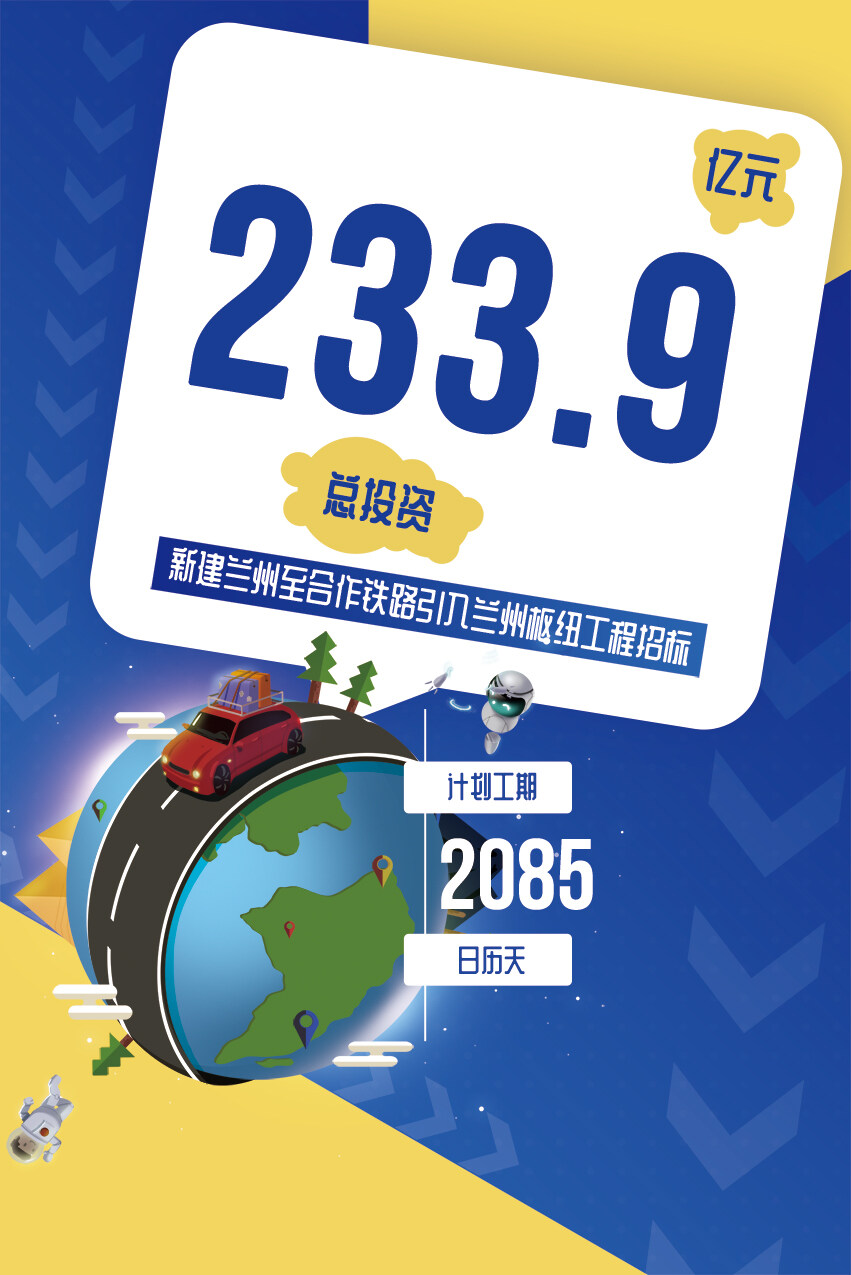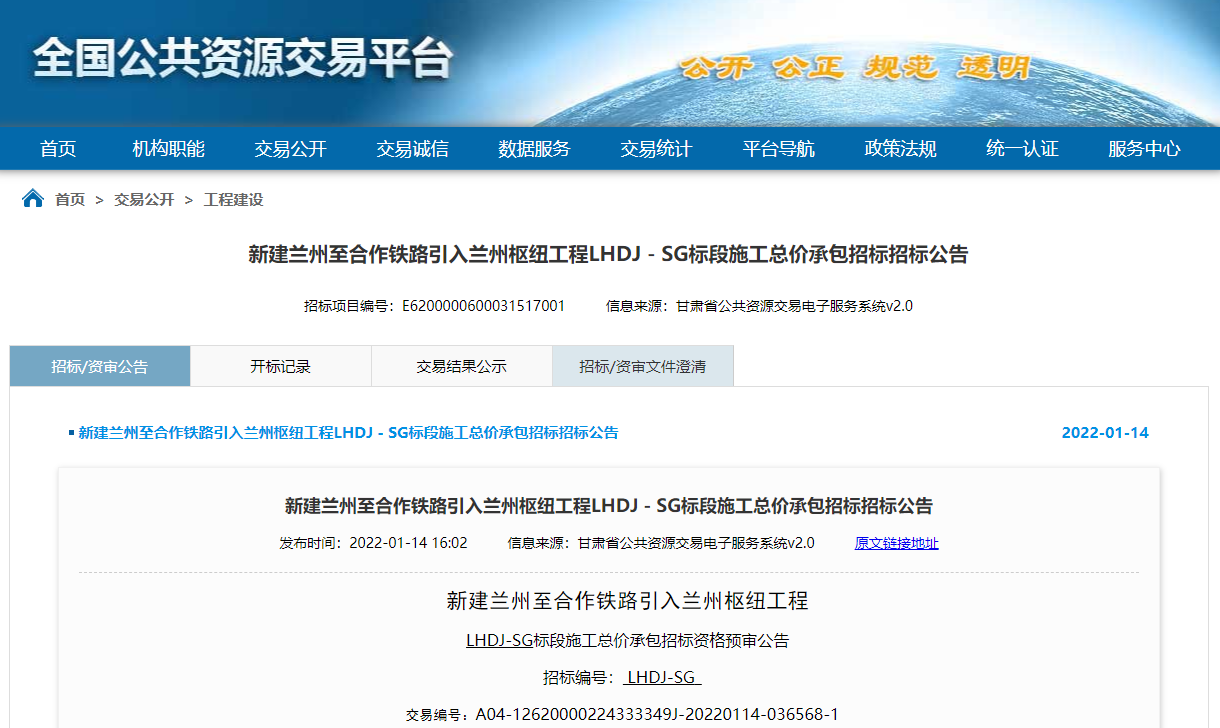 2022年1月16日,全国公共资源交易平台发布新建兰州至合作铁路引入兰州枢纽工程LHDJ-SG标段施工总价承包招标招标公告,所属行业铁路,招标人中川铁路有限公司,项目总投资233.9亿元,计划工期2085日历天。