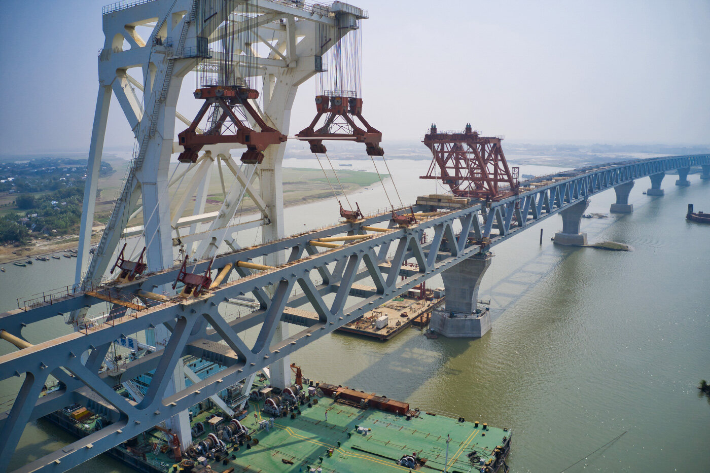 恒河三角洲的下游水域十分宽广,存在的大量泥沙堆积,面对如此巨大的桥梁工程,不可能在这种湿软的泥土上建造,所以中国施工工程师们决定将钢材打入河床下的泥土中,并且向泥土中注入钢筋混凝土的桥梁管斜装,让河床下形成一系列坚实的人造地基。这种方法极大的提高了整个桥梁的承重能力以及稳定性,除此之外,帕德玛河流速大,河流深,吊装也是一个难题,中国团队又把具备取梁,运梁,架梁三位一体功能的天一号起重船开过来,成功解决了这一难题。让这座长达六公里的大桥能够跨越宽广的河道。不仅仅是地基的建造难度非常大,帕德玛大桥对于整孔制造线型的控制要求也非常高。为了保证桥梁的施工质量,中铁大桥局研制创新出了3200吨钢梁整孔架设施工工艺。由此桥梁建设结构和性能上的诸多难题便迎刃而解,这使得桥梁的建造效率大大提升。免去了一系列冗长繁琐的施工工艺,并且在这之中为了能提高桥梁的稳定性。中国还采用了一种新型的焊吸技术,用到了最先进的gps系统,在此基础上。将所有焊接点的误差控制在了1/50万,而这项技术的实施也能极大的提高桥梁的使用寿命。最终帕德马大桥成功建造并且预计将在2022年通车。
