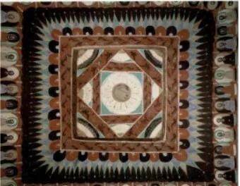 ②盘茎莲花藻井:是隋代独有的一种藻井。特征为井内是一八瓣大莲花莲花周围盘绕变形茎蔓忍冬纹纹样倾向自然形态井外有圆形连珠纹、忍冬纹、白珠纹三道边饰长、大精美的三角纹垂幔。隋代藻井作品没有程式形象新颖,千变万化各逞其思,各有其妙。