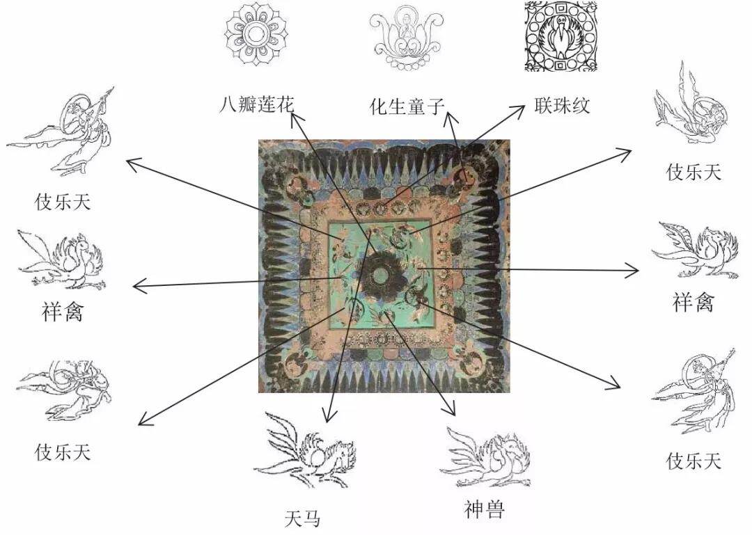 ③飞天莲花藻井:井心较宽大,大莲花周围画若干飞天绕莲花飞翔。此类藻井装饰已超越了窟室的空间,让人有一种举首高望空旷辽阔的感觉。