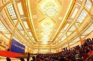 人民大会堂安会厅在很多地方也运用到了敦煌藻井元素。顶部天花板中央镶嵌着水晶玻璃组成的,吸顶大花灯周围是点金石开雕塑和棋盘式的彩色藻井其风格来源于敦煌唐代藻井裝饰以类似盛唐莫高窟第31窟深井的莲花为元素,结合了建筑结构、灯光照明、通风等功能的需要,以石膏花浮雕的形式组成人民大会堂特有的民族形式的装饰风格。