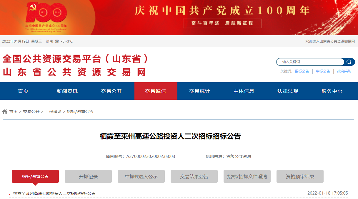 2022年1月18日,山东省公共资源交易网发布栖霞至莱州高速公路投资人二次招标招标公告,所属行业公路,招标人烟台市交通运输局,项目总投资约128.9亿元。