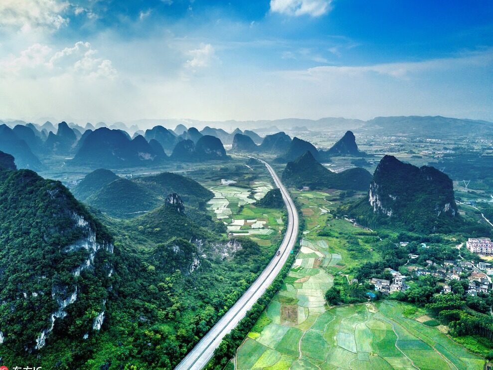 十万大山连接线:路线全长14.908km,采用二级公路标准,设计速度为60km/h,路基宽度为10m。设置大桥288m/2座,涵洞34道,平面交叉2处。