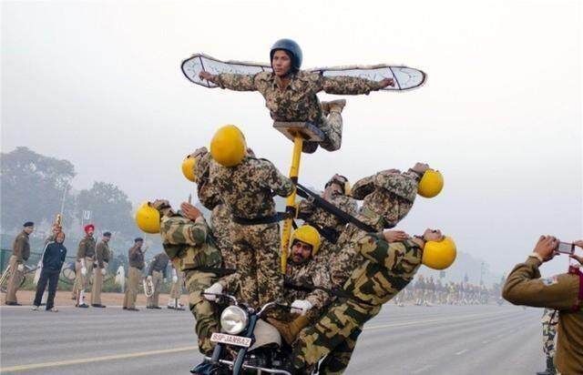 比如其它国家的阅兵式上,军人们都是迈着整齐的步伐,呈方阵接受检阅。而印度的阅兵式,完全是一场杂技表演,七八名士兵同乘一辆摩托,还时不时进行些高难度的动作,令人错愕不已。