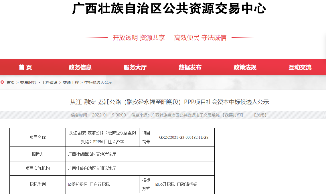 2022年1月19日,广西壮族自治区公共资源交易中心发布从江-融安-荔浦公路(融安经永福至阳朔段)PPP项目社会资本中标候选人公示,中建股份携9家中建系子公司,揽获216亿高速大单!