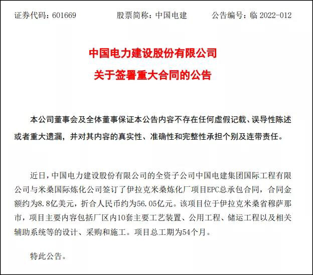 中国电建1月18日晚间公告,近日,中国电力建设股份有限公司的全资子公司中国电建集团国际工程有限公司与米桑国际炼化公司签订了伊拉克米桑炼化厂项目EPC总承包合同,合同金额约为8.8亿美元,折合人民币约为56.05亿元。