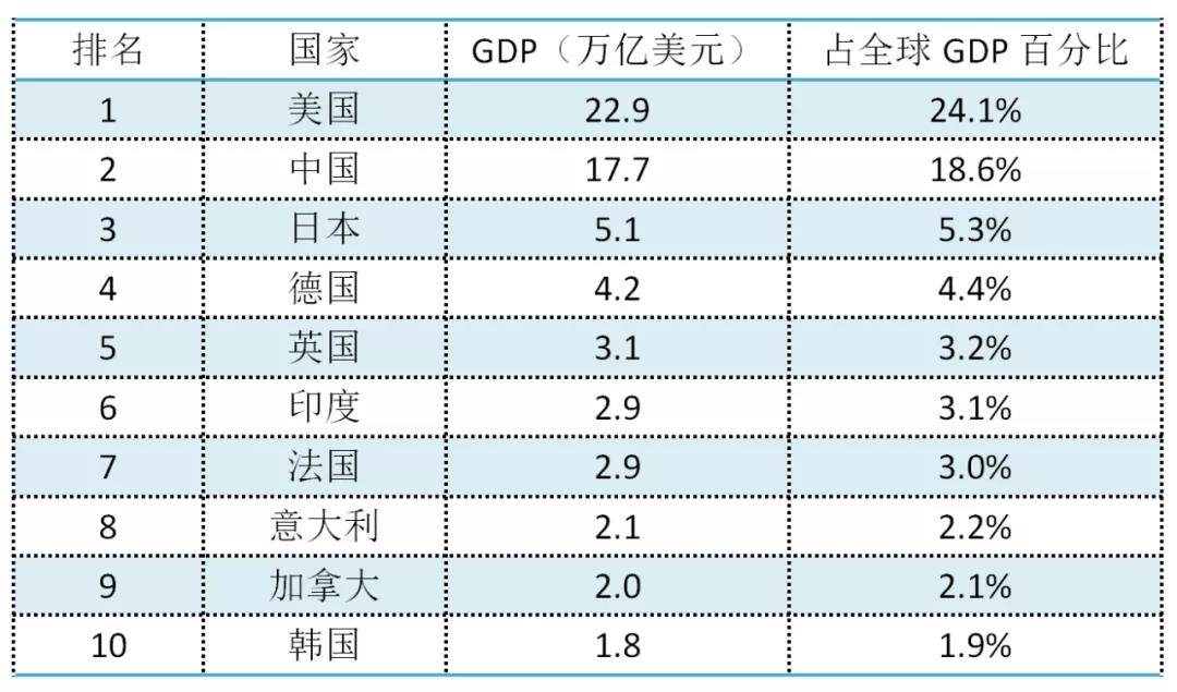下表为2021年全球GDP排名前10的国家: