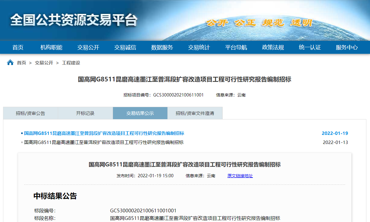 2022年1月19日,全国公共资源交易中心发布国高网G8511昆磨高速墨江至普洱段扩容改造项目工程可行性研究报告编制招标公告,贵州省交通规划勘察设计研究院股份有限公司拿下该项目。