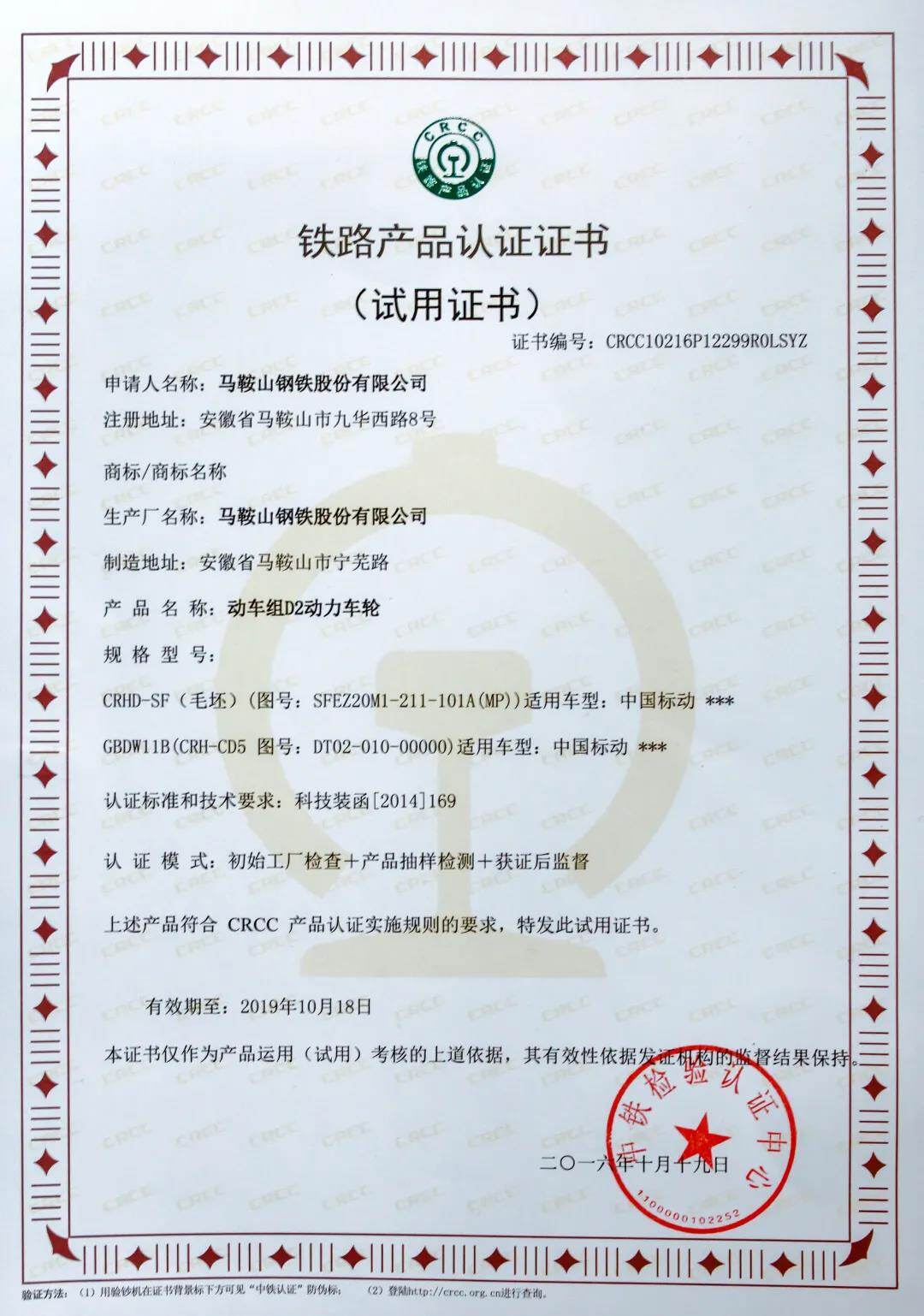 2016年,马钢高速车轮获得中国第一张CRCC认证证书