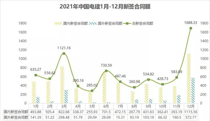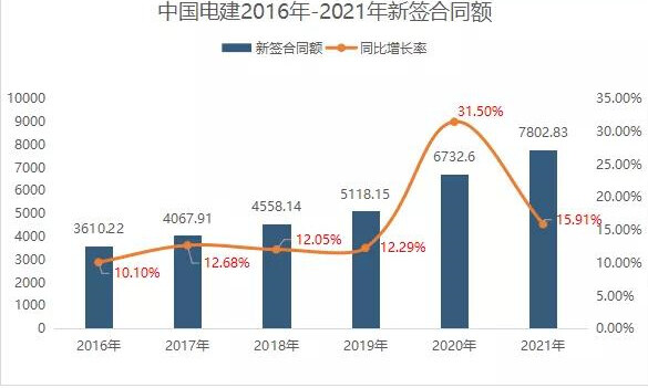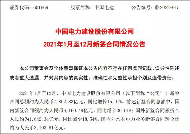 近日,中国电建股份有限公司发布最新企业公告,2021年全年,中国电建累计完成新签合同额7802.83亿元,同比增长15.91%。