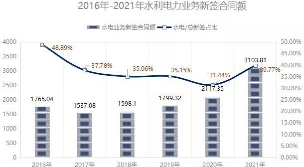 国内外水利电力业务,保持领先优势。中国电建因水而生、因水而兴,夜以继昼、终打响了“水利水电第一品牌”的招牌。水电规划设计,承担了中国80%以上河流及水电站的规划设计任务、65%以上的风力发电及太阳能发电工程的规划设计任务。水利电力建设一体化能力和业绩位居全球第一,占有全球50%以上的大中型水利水电建设市场,傲视群雄。2021年中国电建国内外水利电力业务新签合同额合计约为人民币3,103.81亿元,同比增长46.6%,创历年新高!