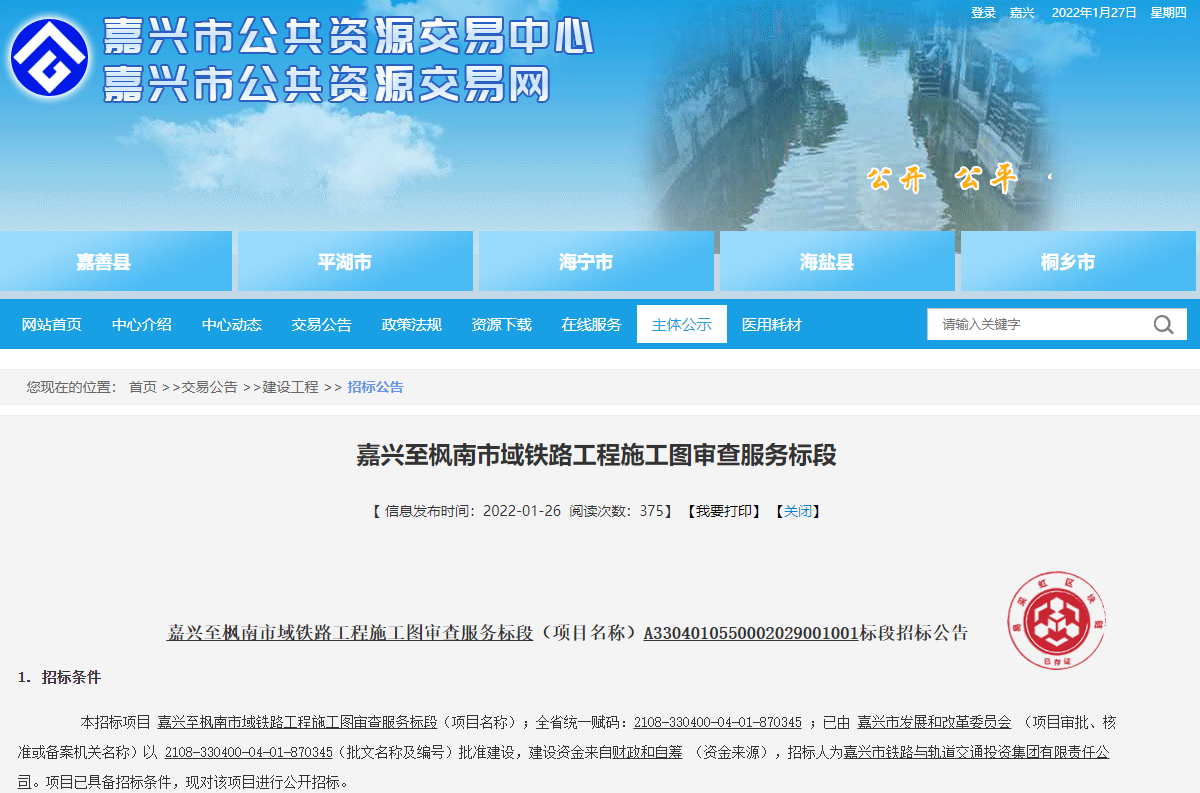 2022年1月26日,嘉兴市公共资源交易中心发布嘉兴至枫南市域铁路工程施工图审查服务标段招标公告,所属行业铁路,招标人嘉兴市铁路与轨道交通投资集团有限责任公司,项目总投资210.5亿元。
