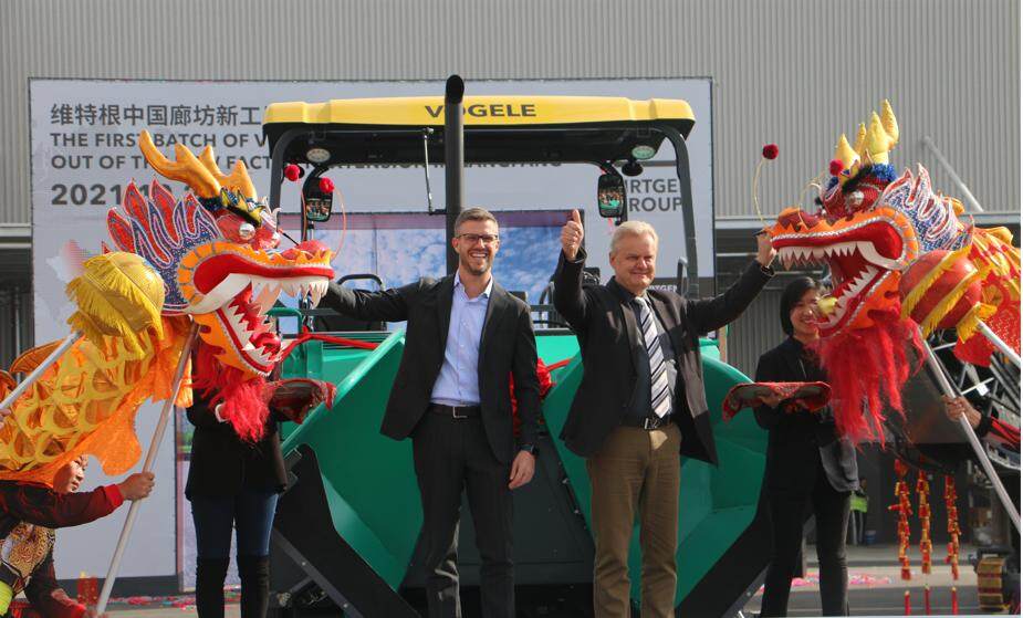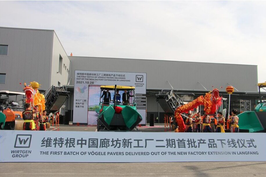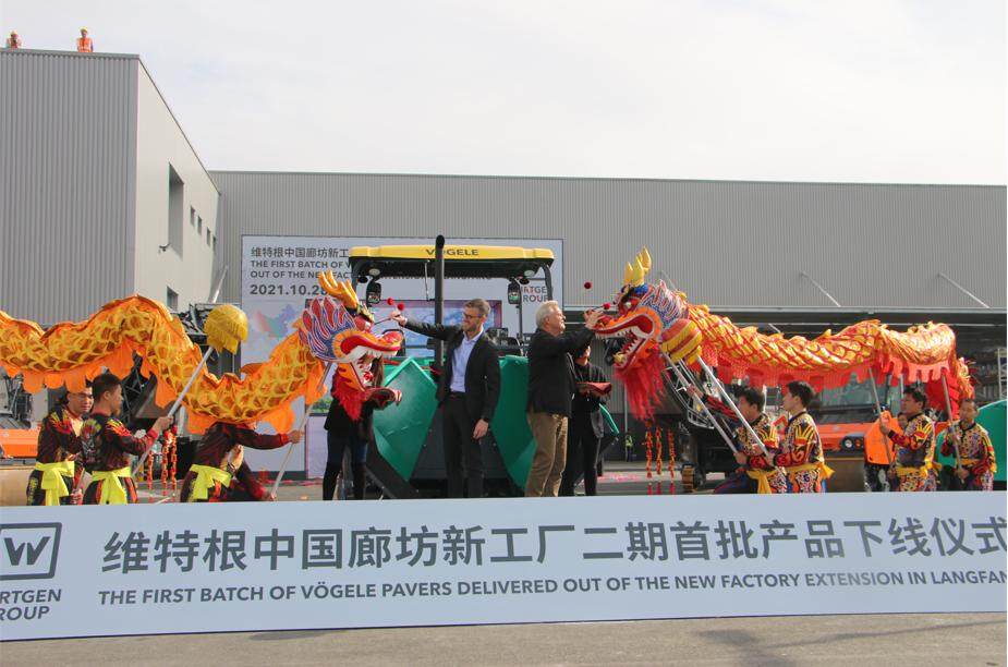 On October 28, 2021, the launch ceremony of the first batch of products of the second phase of Wirtgen's new Langfang factory in China was successfully held, which also means that the second phase of the expansion of the new Langfang factory was officially completed and put into use. Taking into account the needs of epidemic prevention and control at this stage, the new Langfang factory only held a simple and solemn celebration ceremony inside. With the celebration of Longteng, the first batch of new models rolled off the production line from the second phase - the VÖGELE Super 1680 Li, carrying Mr. Ulrich Reichert (Witzertu), President and Managing Director of Wirtgen China, and Chief Operating Officer Carl Doering slowly entered the ceremony site, which marked another successful milestone in the history of Wirtgen China's development.