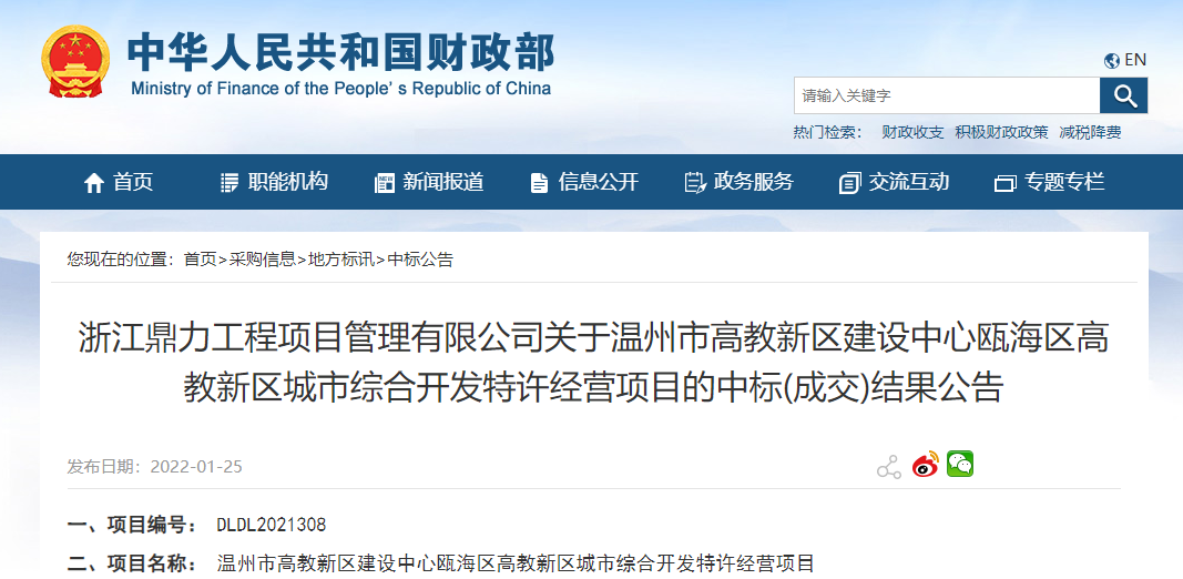 2022年1月25日,瓯海公共资源交易网发布温州瓯海区高教新区城市综合开发特许经营项目中标候选人公示,温州市名科建设发展有限公司中标该项目,项目总投资估算265亿元。