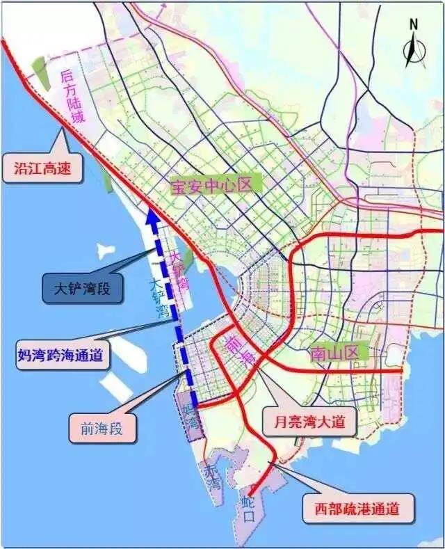 妈湾跨海通道(月亮湾大道-沿江高速)呈南北向布置,南起于妈湾大道与月亮湾大道相交处,与现有妈湾大道高架桥对接,向北穿越前海湾海域,最终止于沿江高速大铲湾收费站及金湾大道与西乡大道相交处。该工程途经前海妈湾及宝安大铲湾两区域,路线全长约8.05公里,其中前海段2.5公里,海域段1.1公里,大铲湾段4.45公里。