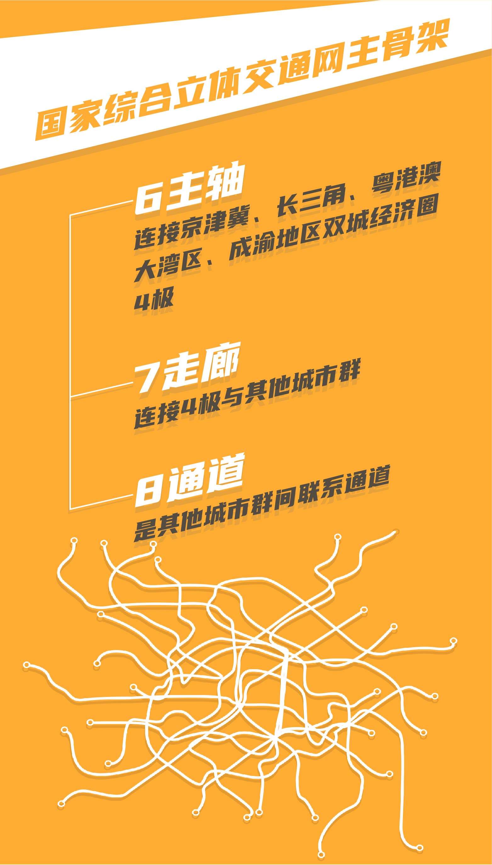 国家综合立体交通网主骨架由“6主轴7走廊8通道”组成,6主轴连接京津冀、长三角、粤港澳大湾区、成渝地区双城经济圈4极,其中京津冀—长三角主轴途经天津;7走廊连接4极与其他城市群,其中京哈走廊途经天津;8通道是其他城市群间联系通道。