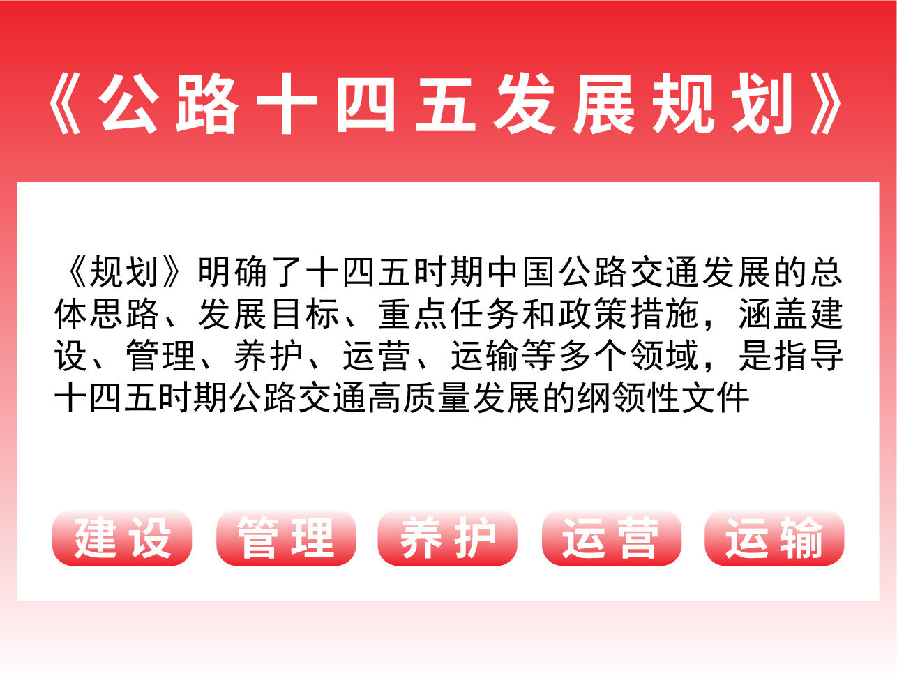 该负责人表示,《规划》紧紧围绕新阶段、新理念、新格局发展要求,全面贯彻落实《交通强国建设纲要》《国家综合立体交通网规划纲要》部署要求,突出公路交通高质量发展主题,从解决“有没有”转向重点解决“好不好”,更加注重推动“建管养运”协调发展,更加注重加强与其他运输方式、关联产业的融合发展,更加注重提升供给质量、服务品质和服务体验。