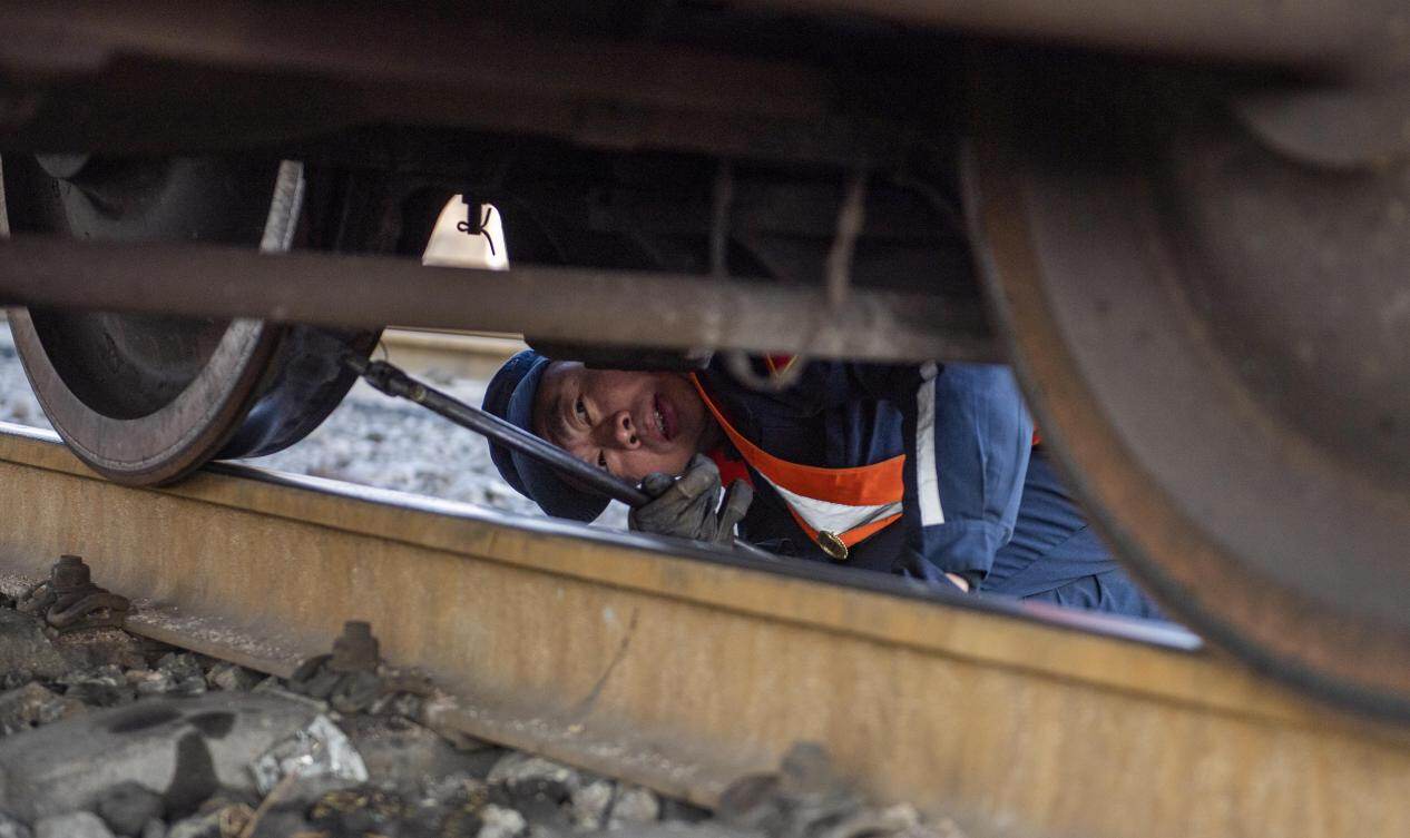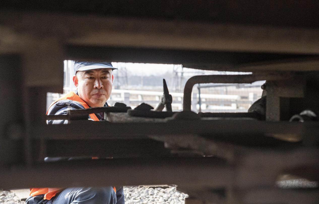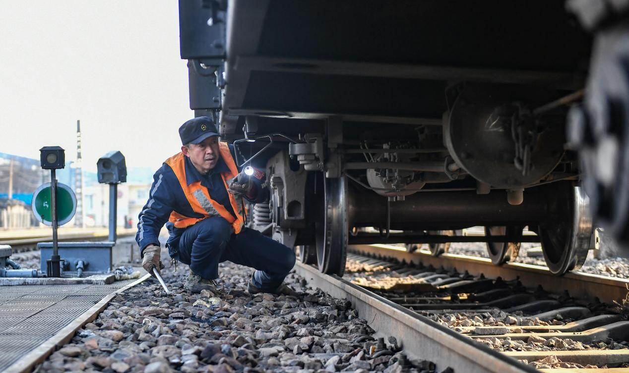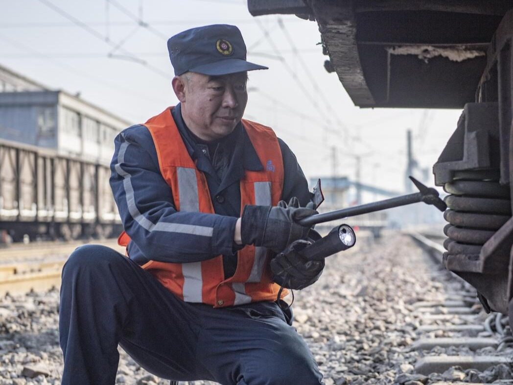 为确保电煤和物资运输,听音辨伤的检车员,每天通过千锤百炼来确保列车运行安全。春运期间,他们的工作量由日均检查6.7列增加至13.5列,比平时多出一倍。