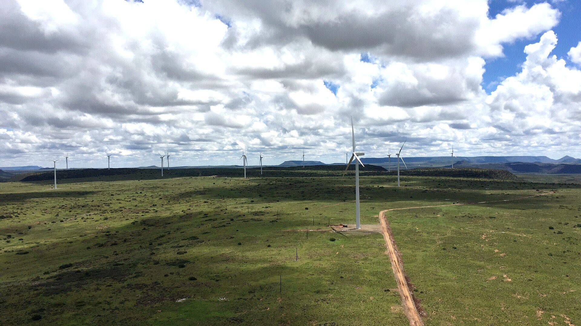 大西洋东岸,一座座风电机组在南非北开普省德阿镇的广袤山地上巍然屹立。白色风机缓缓转动,将清洁电力送入30万户当地居民家中。这是由中国国家能源集团龙源南非公司承建并运营的德阿风电项目,也是南非已投产的规模最大的风电项目之一。