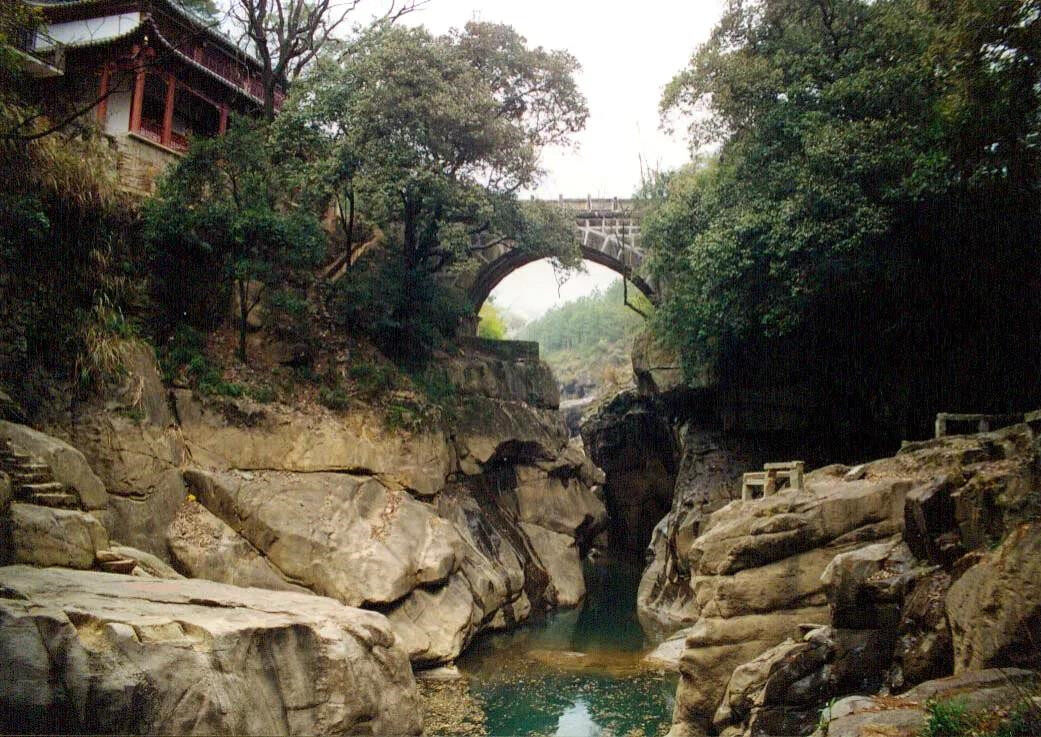يمتد تاريخ جسر الخوانق الثلاثة إلى أكثر من ألف عام. ولم يتم إعادة بناء الهيكل الرئيسي. وبعد عدة زلازل وفيضانات مفاجئة لا حصر لها ، ما زال يقف على بركة عميقة من الصخور الخطرة ، مما يدل على أن جيانغشي لديها بالفعل بناء جسر رائع التكنولوجيا في العصور القديمة.