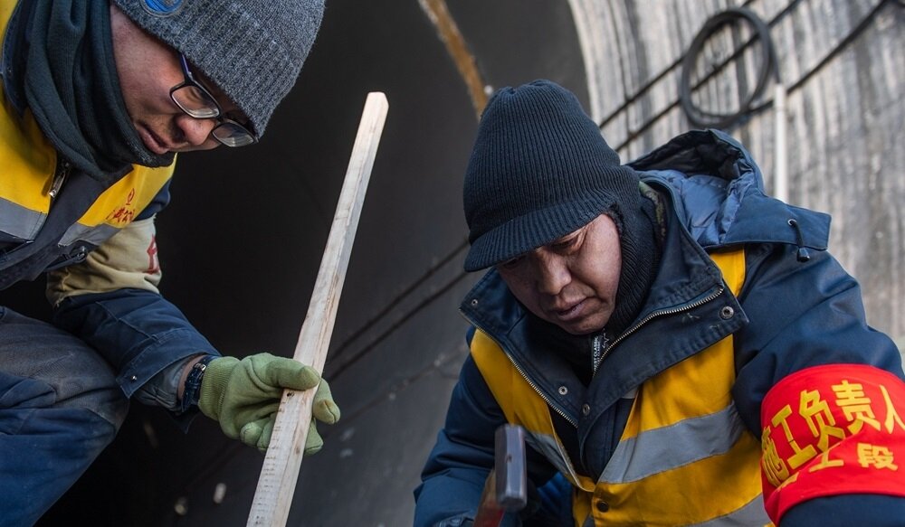 隧道内凛冽寒风吹得人几乎站不住脚,呼呼的风穿透身体。鄂年明顶着风,手拿测量工具,走走停停,还不时跪在零下三四十度的钢面上,仔细查看线路平顺情况。