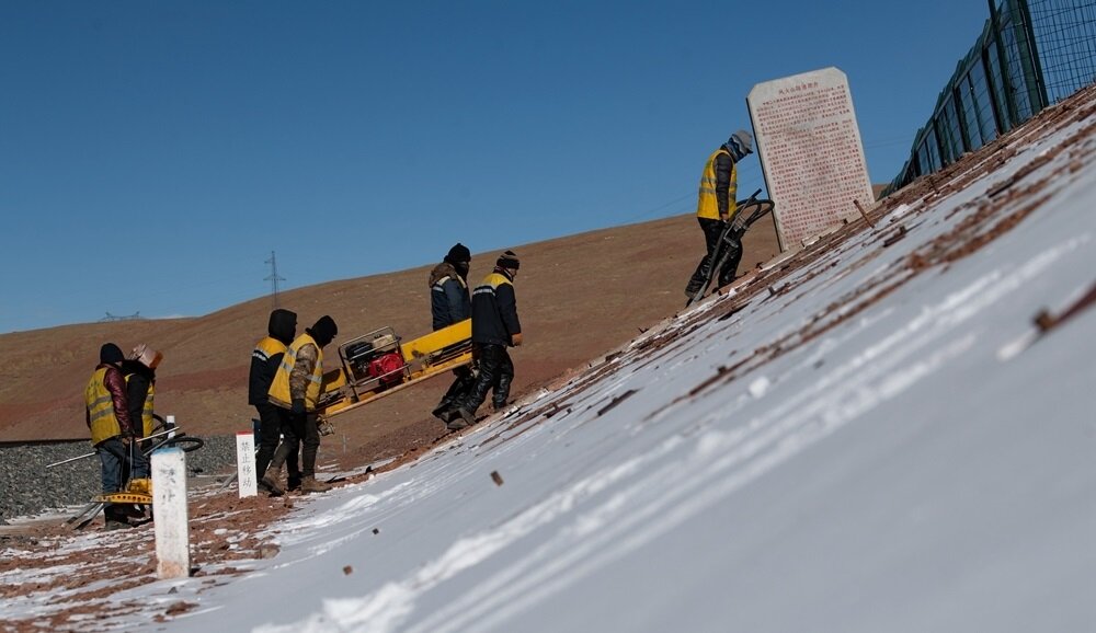时而在铁轨上敲敲打打,时而趴在铁轨上观察平整度……中国铁路青藏集团公司格尔木工务段秀水河线路车间的职工不畏高寒缺氧,顶风冒寒坚守在这里。