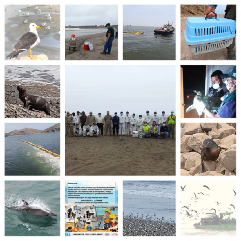 2022年1月18日,汤加火山爆发引发异常巨浪,离秘鲁钱凯港项目35公里以外的一家炼油厂发生漏油事故,项目附近海域有大面积的海水遭受污染,危及周边鸟类和海洋生物。漏油事故发生后,四航局秘鲁钱凯港项目秉持高度的社会责任感和建设绿色港口的初心立场,果断启动环境保护应急预案,全力挽救海洋环境和海洋生物。