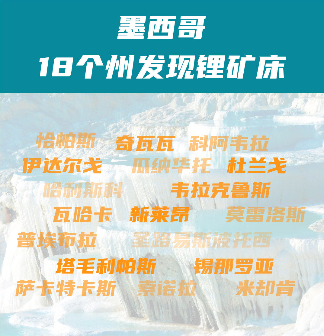 墨西哥地调局的研究表明,该国有18个州已发现锂矿床。包括:恰帕斯、奇瓦瓦、科阿韦拉、杜兰戈、瓜纳华托、伊达尔戈、哈利斯科、米却肯、莫雷洛斯、新莱昂、瓦哈卡、普埃布拉、圣路易斯波托西、锡那罗亚、索诺拉、塔毛利帕斯、韦拉克鲁斯和萨卡特卡斯。