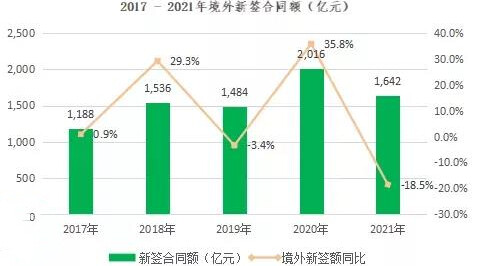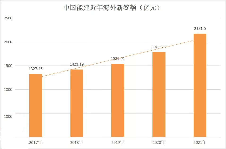 近年来,中国能建海外领域新签额数据一直呈良好的上升趋势,2021年企业海外新签额达2171.5亿元,首次突破2000亿关卡,实现最高增幅的一年。