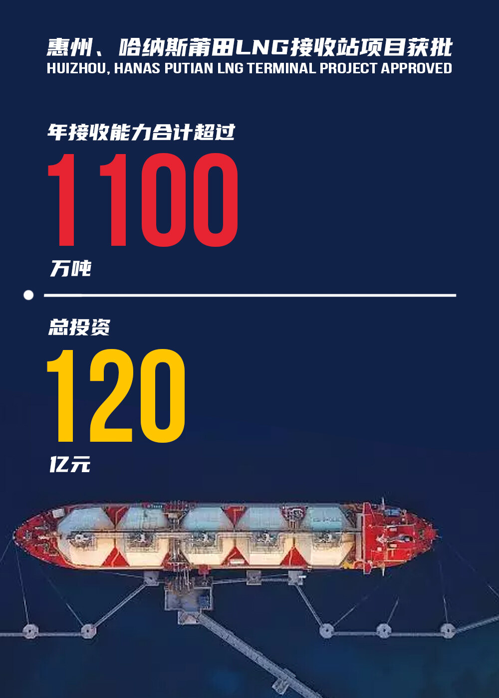 为进一步落实长期购销协议和LNG资源,控制气源成本,国内将再添两座液化天然气(LNG)接收站,年接收能力合计超过1100万吨,总投资近120亿元。2022年2月16日,国家发改委发布消息称,同意建设哈纳斯莆田LNG接收站项目和惠州液化天然气(以下简称LNG)接收站项目。