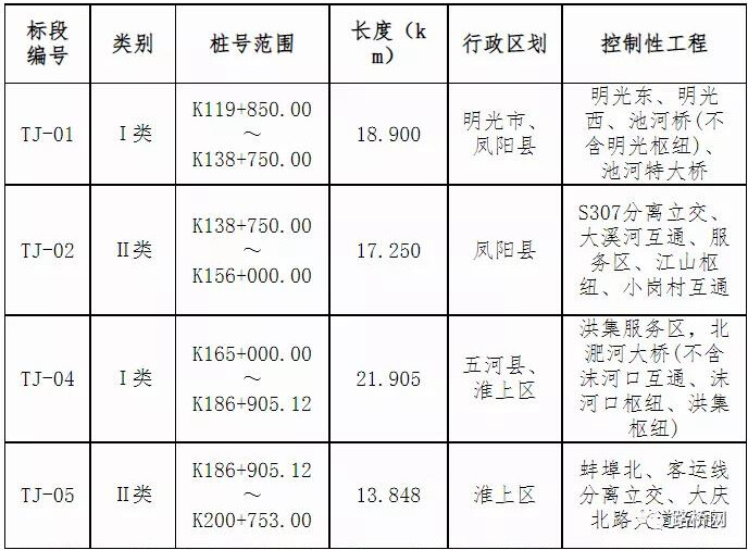 G36宁洛高速公路明光至蚌埠段改扩建工程施工共分为五个标段,本次招标的为TJ-01、02、04、05标四个标段,工程内容包含的路基、路面、桥涵、交叉、交安设施、绿化环保、机电预留预埋等工程的实施、完成及缺陷修复(工程量详见招标图纸和工程量清单),其中TJ-04标还包含下穿京沪高铁代建范围内的路面、老路改造、地方缆线迁改、交安设施等工程内容;TJ-05标还包含京沪货运、蚌埠北互通和京沪客运代建范围内的路面、伸缩缝(不含预留预埋件)、交安设施、绿化环保、机电预留预埋以及10KV以下(含10KV)电力杆线、弱电杆线迁改。具体如下: