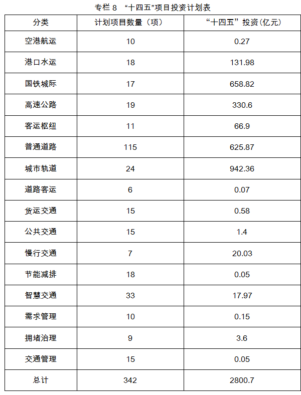 高快速路网规划方面,规划期内,高快速路总投资约4995.7亿元,其中,高速公路投资约2242亿元,快速路投资约2753.7亿元。规划高快速路总规模达1984公里,密度达到52公里/百平方公里,路网覆盖水平大幅提升。