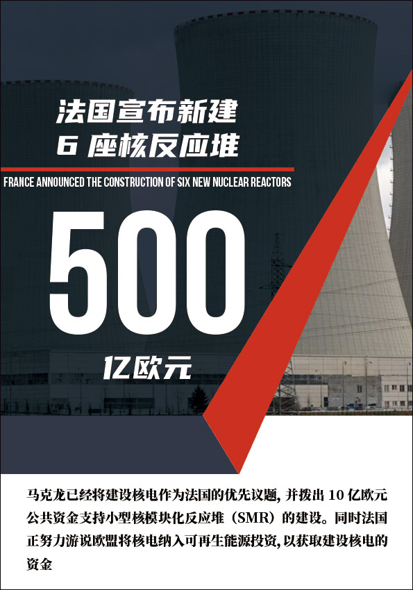 马克龙已经将建设核电作为法国的优先议题,并拨出10亿欧元公共资金支持小型核模块化反应堆(SMR)的建设。同时,法国正努力游说欧盟将核电纳入可再生能源投资,以获取建设核电的资金。(转载请注明见道网www.seetao.com)见道网一带一路栏目编辑/徐宁、设计/张韬