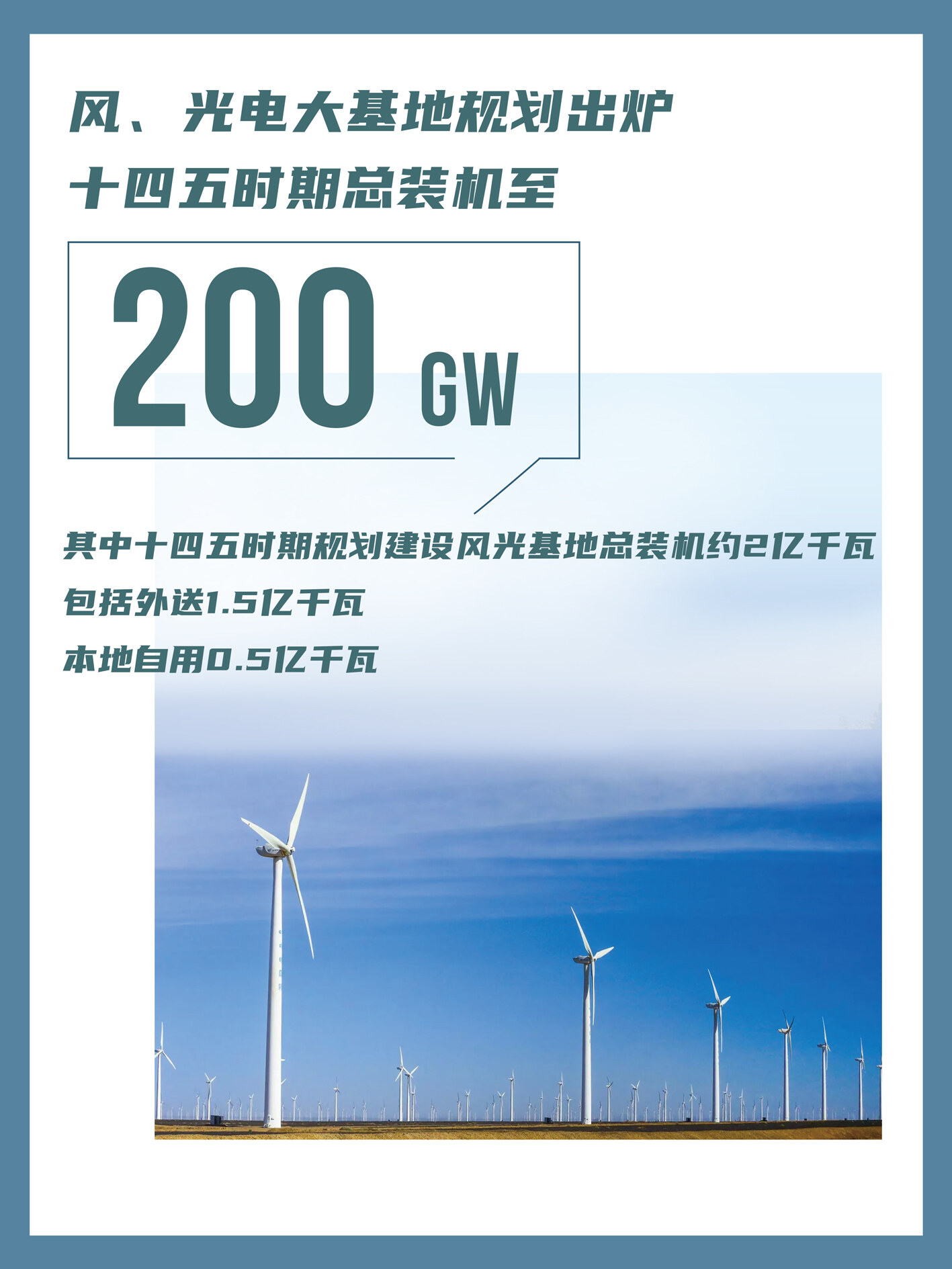 其中,"十四五"时期规划建设风光基地总装机约2亿千瓦,包括外送1.5亿千瓦、本地自用0.5亿千瓦;“十五五"时期规划建设风光基地总装机约2.55亿千瓦,包括外送1.65亿千瓦、本地自用0.9亿千瓦。