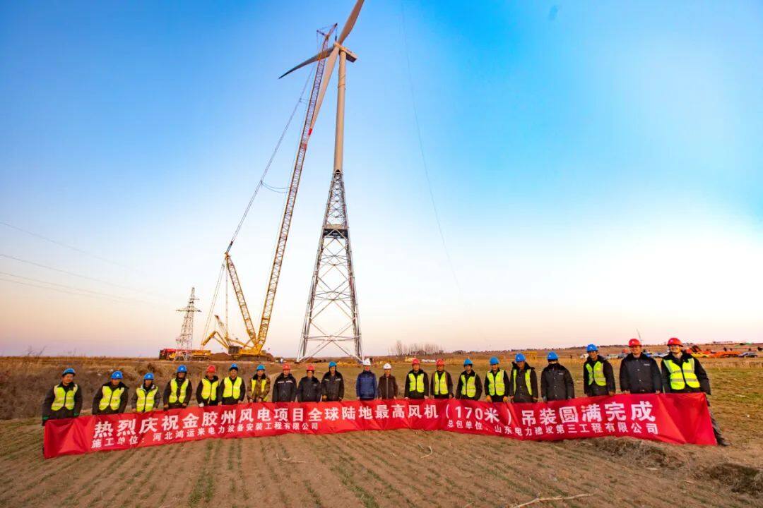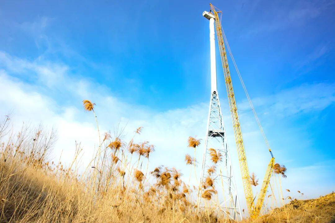 作为山东省第一个分散式成批量风电项目,该风机的成功就位具有里程碑意义,它采用的具有世界领先水平的预应力抗疲劳构架式钢管风电塔架,相较于行业常见的120-140米的柔性塔,风机高度可以大幅提升,能更好地利用风资源,增加发电有效时数。