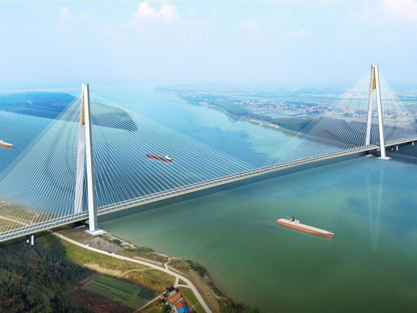 观音寺长江大桥是武汉至松滋高速公路江陵至松滋段过江通道的关键性控制工程,距离上游荆州长江大桥约31.3公里,距离下游荆州长江公铁两用大桥约13.7公里。主桥全长1860米,主跨为1160米的双塔双索面混合式组合梁斜拉桥,一孔跨越可通航水域,两岸边跨分别跨越耀新民垸围堤及荆南长江干堤。大桥采用双向六车道建设标准,桥宽41米,桥塔采用A型索塔,塔高262米,建成后将是世界首座超过千米的混合式组合梁斜拉桥。关键词:交通项目建设、国内工程
