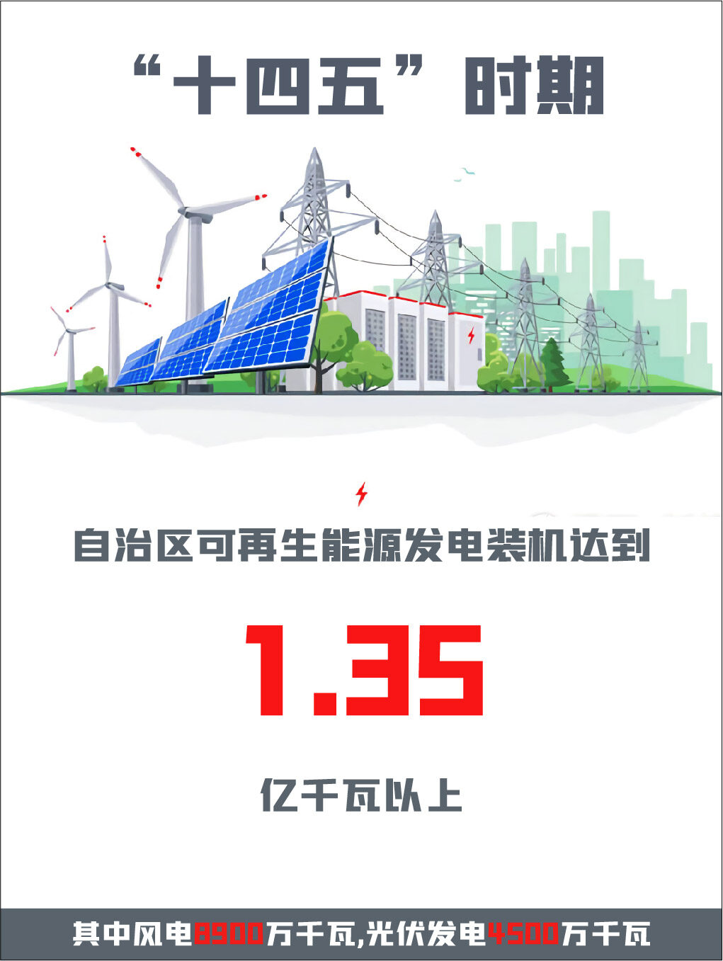 “十四五”时期,自治区可再生能源发电装机达到1.35亿千瓦以上,其中风电8900万千瓦、光伏发电4500万千瓦,新能源装机规模超过燃煤火电装机规模,新能源发电量占自治区总发电量比重超过35%。“十四五”期间可再生能源新增装机8000万千瓦以上,占全部新增装机的比重超过60%,成为新增装机的主力。