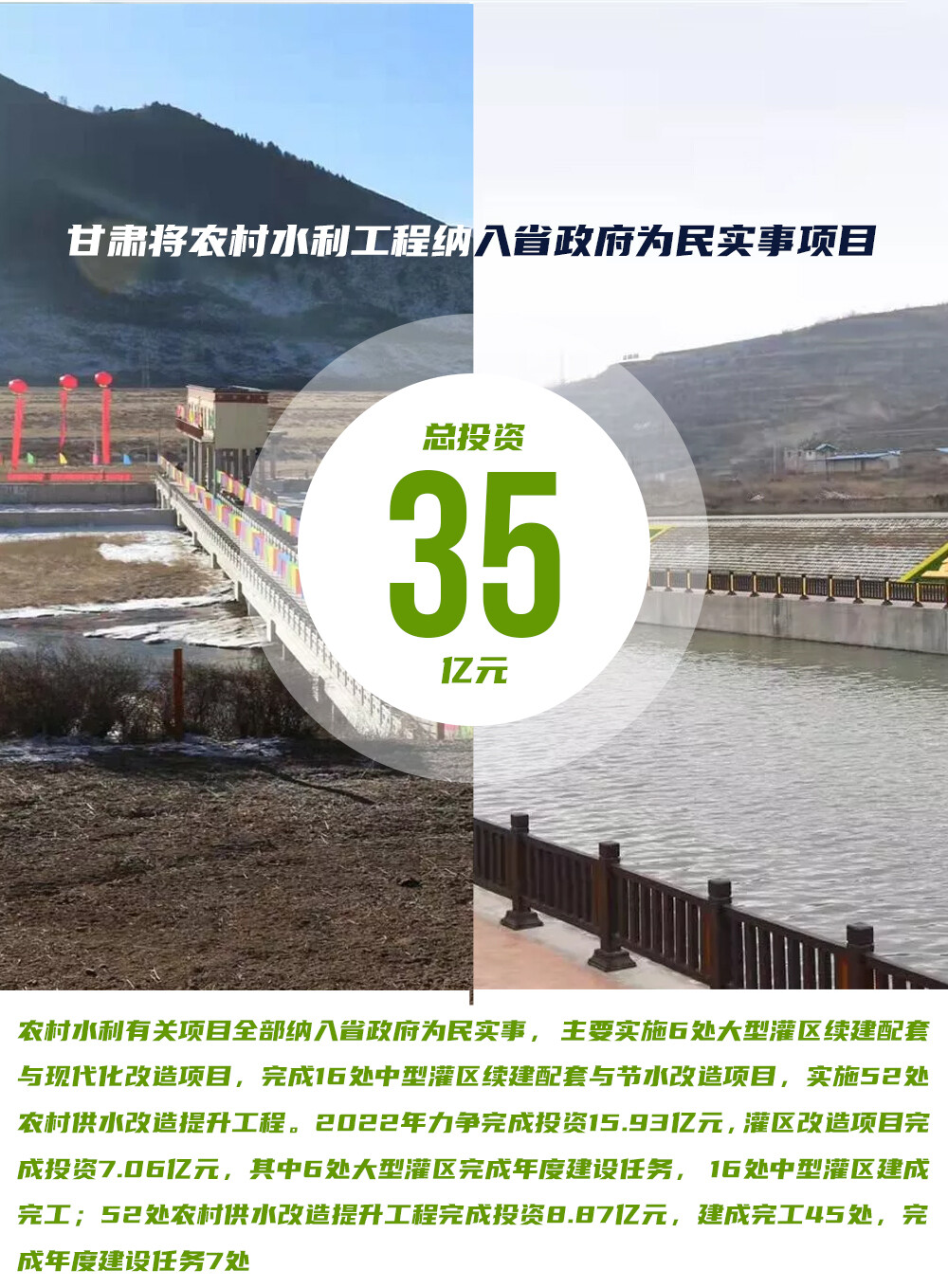 近日,甘肃省人民政府办公厅《关于印发10件为民实事方案的通知》,将《关于“打通最后一公里”农村水利惠民工程的实施方案》纳入为民实事,建设内容主要包括调蓄设施、灌区改造和农村供水等三大类项目,总投资35亿元。其中,农村水利有关项目全部纳入省政府为民实事,主要实施6处大型灌区续建配套与现代化改造项目,完成16处中型灌区续建配套与节水改造项目,实施52处农村供水改造提升工程。2022年力争完成投资15.93亿元,灌区改造项目完成投资7.06亿元,其中6处大型灌区完成年度建设任务,16处中型灌区建成完工;52处农村供水改造提升工程完成投资8.87亿元,建成完工45处,完成年度建设任务7处。