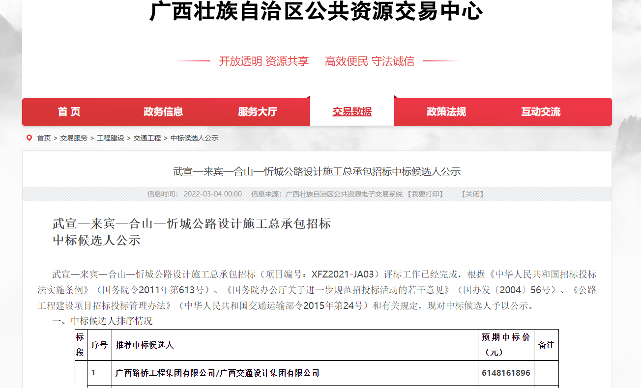 2022年3月4日,广西公共资源交易中心发布武宣—来宾—合山—忻城公路设计施工总承包项目中标候选人,中铁一局、广西路桥、广西路建中标广西高速项目!