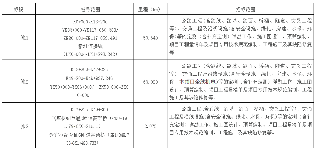 本次招标范围为主线K0+000~K49+987.346段、YK50+000~YK117+060.683/ZK50+000~ZK117+058.491段和新圩连接线LK0+000~LK1+393.342段的施工图勘察设计和相应工程施工的总承包,划分为3个标段,具体内容为: