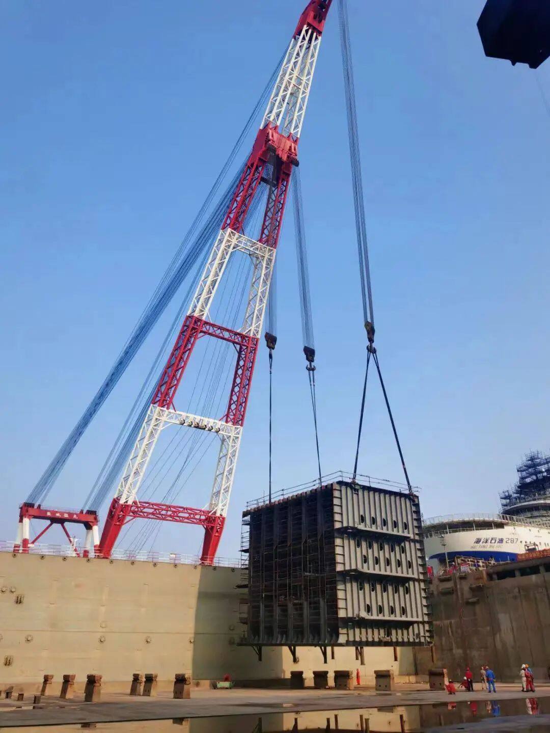 "Haiyang Shiyou 229" has 6 new pontoon sections, each weighing up to 415 tons, which is the largest section in Wenchong's dry dock. Wenchong built and transported the sections to the bottom of the dock through a floating crane, and then used the module car to translate the dock, and used a three-dimensional hydraulic locator to assist in the installation and positioning, and efficiently completed the installation and positioning of 6 sections within four days.
