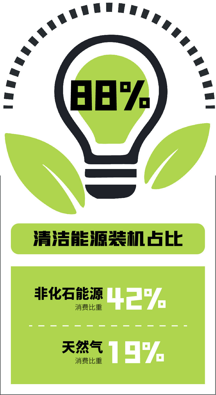 清洁低碳转型持续推进。清洁能源装机占比88%左右。非化石能源消费比重42%左右,天然气消费比重19%左右,完成国家下达的可再生能源电力消纳责任权重目标任务,电能占终端能源消费比重进一步提高。煤炭消费比重进一步降低,煤炭消费量率先达峰。